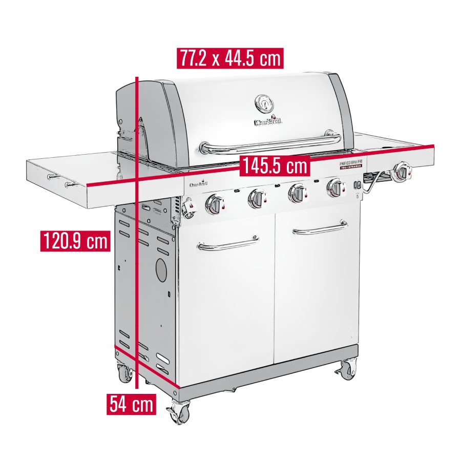 The Professional PRO is solid and made from high-quality stainless steel. The high quality of the materials means that it is resistant to rust and weathering. The spacious interior of the grill can hold an 11 kg gas bottle. For added safety and a great design touch, the LED lights on the temperature controllers glow red when the corresponding burner is switched on.