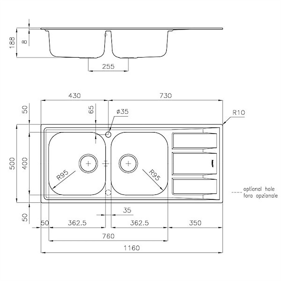 The Foster Sink FM Marine is built for durability and high performance, featuring AISI 316 marine stainless steel, a material known for its exceptional resistance to corrosion from acids, salts, and detergents. This superior-grade stainless steel, commonly used in the marine industry, ensures that the sink withstands demanding kitchen environments. It also offers customization with 2nd and 3rd hole options, allowing for easy installation of double-hole mixers, remote-controlled drains, or soap dispensers, with dotted line markings for added convenience.