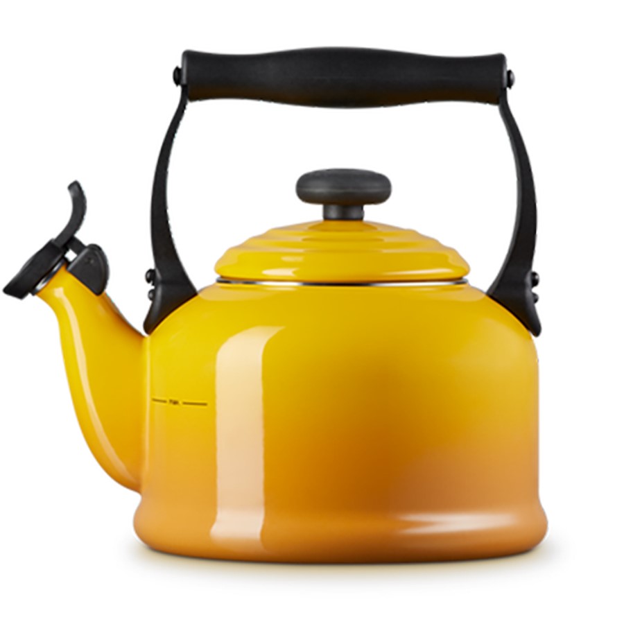 The traditional Le Creuset 2.1L kettle exudes classic charm and functionality. Made from high-quality carbon steel with a vibrant enamel finish, it ensures rapid heating and even heat distribution. Its ergonomic, heat-resistant handle and easy-pour spout provide safe and convenient use. The 2.1L kettle features a fixed whistle to signal boiling water, adding both practicality and a touch of nostalgia. Suitable for all heat sources, including induction, it blends seamlessly into any kitchen decor. While dishwasher safe, hand washing is recommended to maintain its enduring beauty and performance.