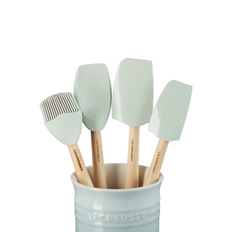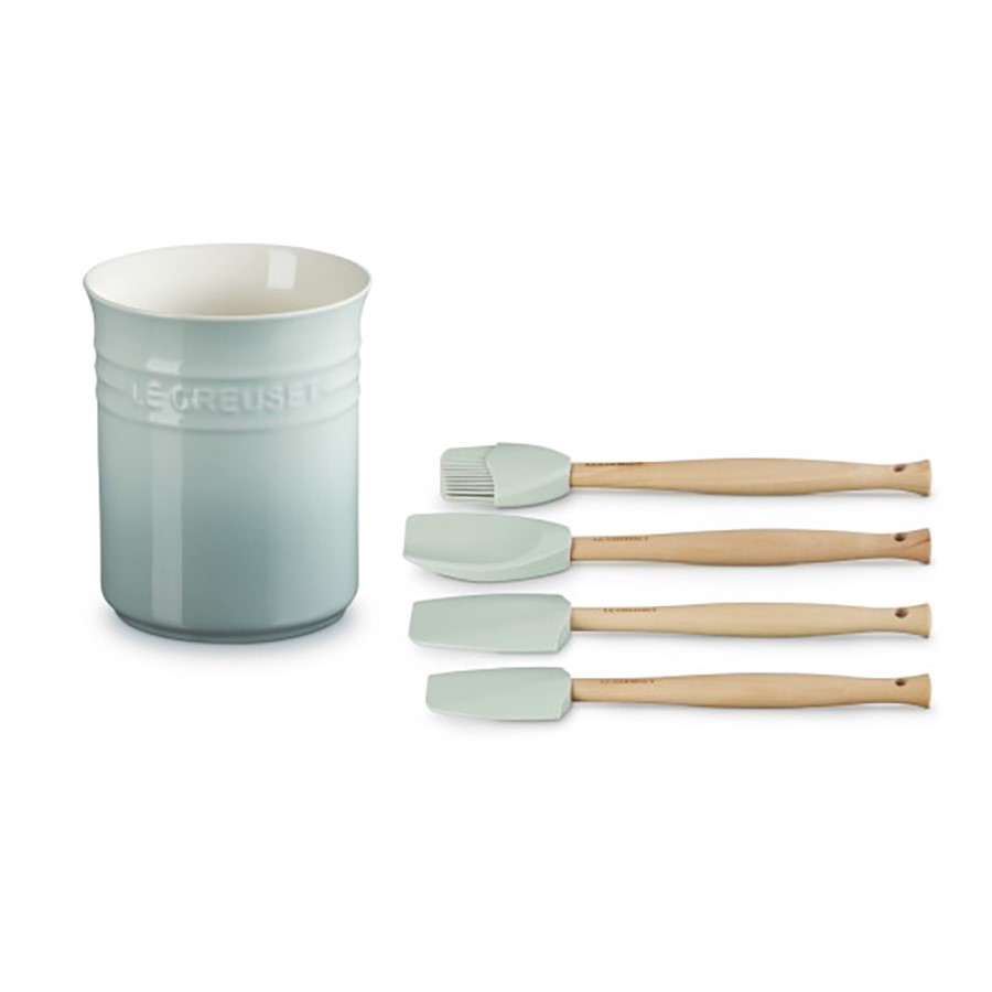 The Le Creuset Craft Series 5-Piece Utensil Set in Sea Salt combines functionality with timeless design. This set includes a basting brush, spoonula, and two spatulas, each crafted from heat-resistant, BPA-free silicone with smooth wooden handles. The accompanying stoneware crock, also in Sea Salt, offers a stylish and durable storage solution for your kitchen tools. The non-porous, scratch-resistant glaze ensures easy cleaning and long-lasting durability. This set is dishwasher-safe and backed by Le Creuset's 10-year warranty, making it a practical and elegant addition to any kitchen.