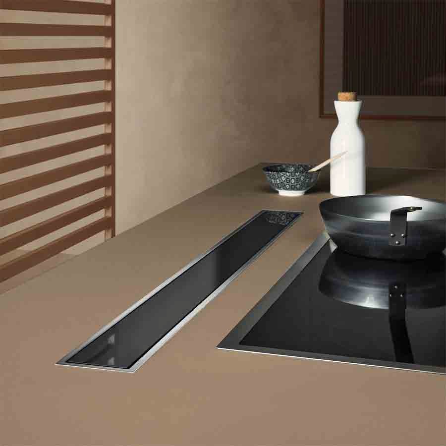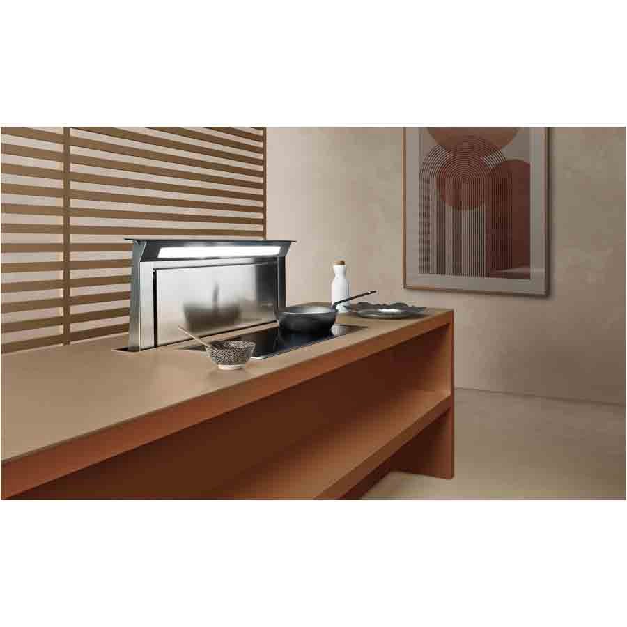 Experience sleek, powerful ventilation with the Falmec Design+ 120 cm Down-Draft Extractor in Black, designed to rise effortlessly from your countertop and discreetly retract when not in use. Crafted from premium AISI 304 Scotch-brite stainless steel and topped with durable tempered glass, it delivers high-efficiency perimeter suction that captures steam and grease right where you cook, while dimmable LED lighting ensures perfect visibility