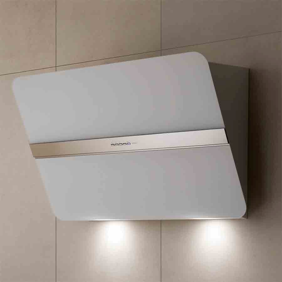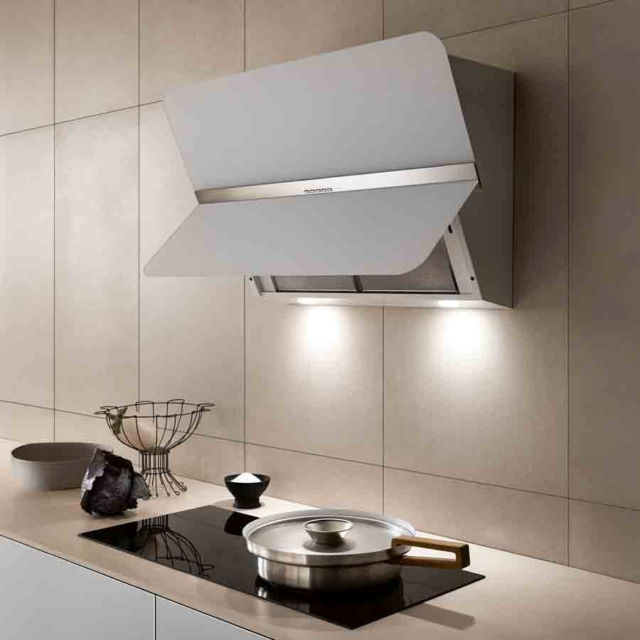 The Flipper wall hood by Falmec has a simple and elegant design characterized by the inclined front in satin glass with a central steel band. Here proposed in the 85 cm version with white finish, the hood is equipped with dynamic and dimmable lighting.