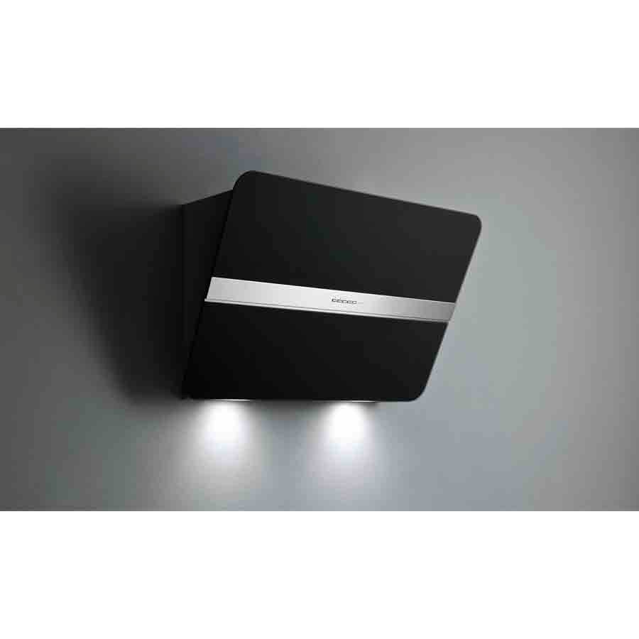 The Falmec Flipper Wall Hood 85 cm (CFPN85.E0P2#ZZZQ491F) in black satin glass combines minimalist elegance with high performance. Its inclined front panel of tempered glass, framed by a sleek steel band, opens to reveal intuitive electronic controls. Powered by a robust 800 m³/h motor, it delivers powerful extraction while keeping noise low (up to 58 dB) and energy efficiency high (Class A)