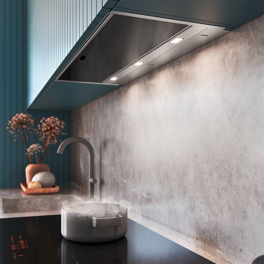 The Falmec Move 60 cm built-in hood is a sleek, retractable design that remains hidden behind kitchen cabinetry until slid forward to engage maintaining perfect minimalism when not in use. Inside, its robust 800 m³/h motor delivers powerful extraction while operating quietly at around 62 68 dB, even when installed just 52 cm above the hob ideal for compact or low profile setups. The lower panel is available in black or white tempered glass atop a stainless-steel body, and opens to reveal an electronic control panel with four speeds, dynamic LED lighting (2,700 5,600 K), and a removable, washable grease filter for easy care. With optional Carbon·Zeo recirculation and accessories like telescopic chimney or glass shelving, this energy class B hood offers discreet elegance, high performance, and seamless integration into modern kitchens.