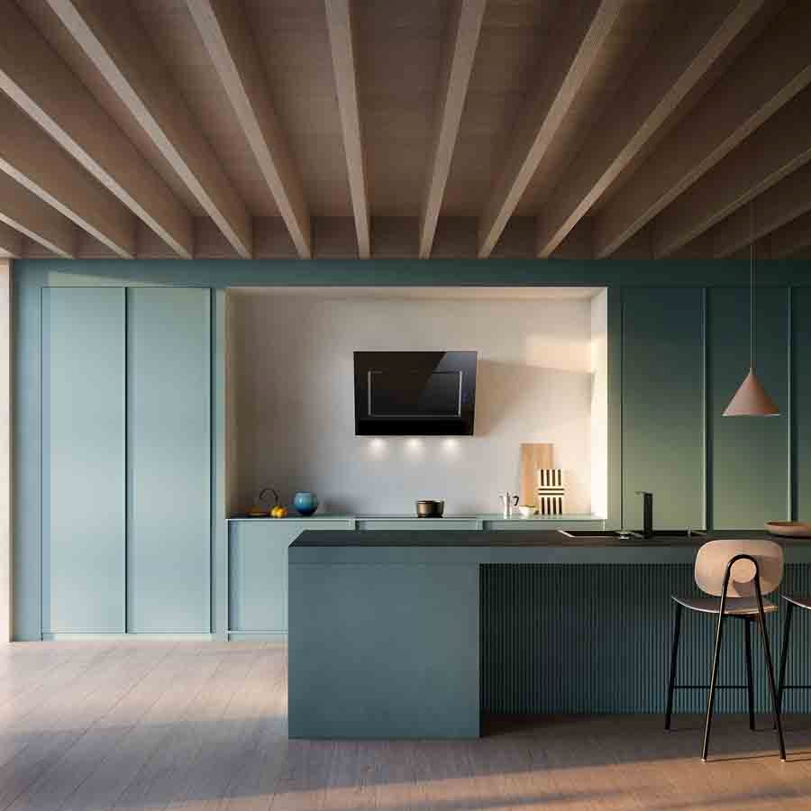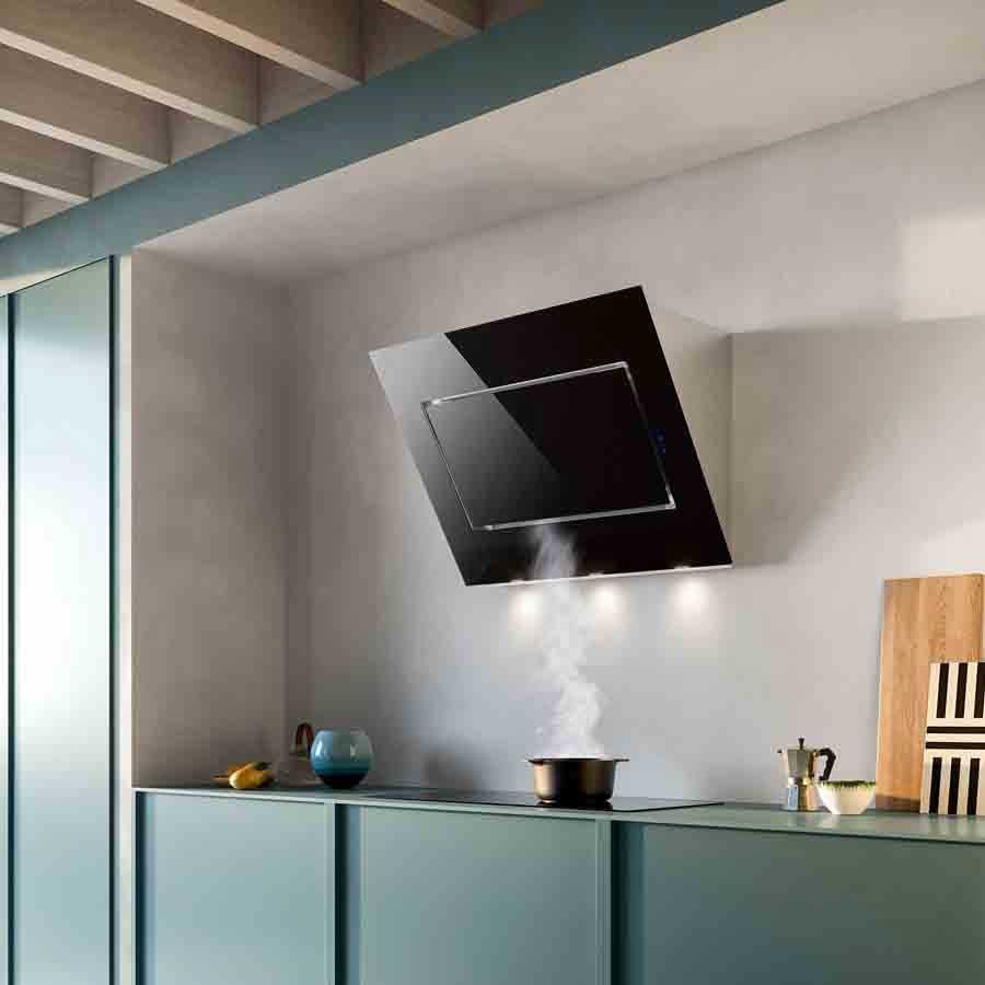 The Falmec Quasar Evo Plus 120 cm wall hood combines modern Italian minimalism with high performance kitchen ventilation. Featuring a sleek black tempered glass front panel within a stainless steel frame (AISI 304 Scotch brite finish), it delivers powerful 800 m³/h perimeter suction to silently clear smoke, grease, and odors while maintaining a clean silhouette