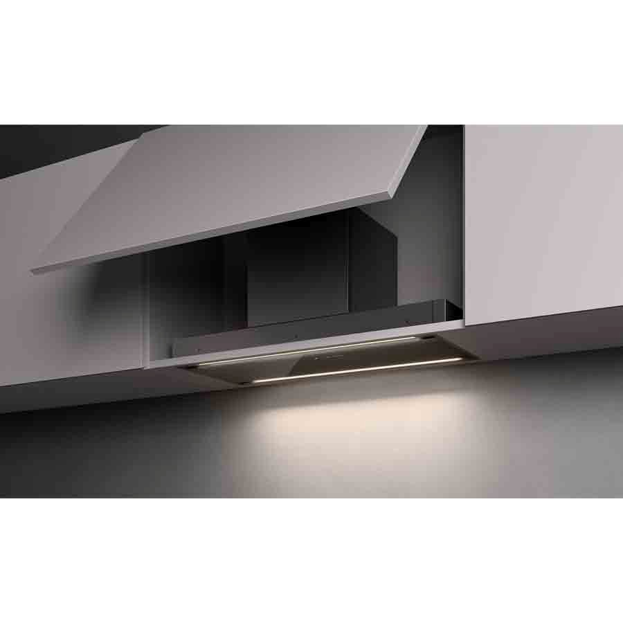 The new falmec kitchen hood Parallel from the Design collection stands out for its flexibility and elegance. The versatility of motor rotation makes it extremely adaptable to any kitchen design.Two parallel lines of dynamic LED Luce, integrated into the structure, help define its streamlined profile, enhanced by a Black or White glass bottom panel with integrated touch control.