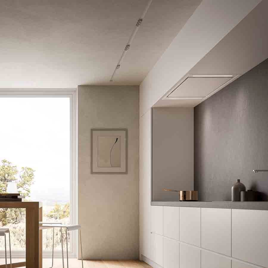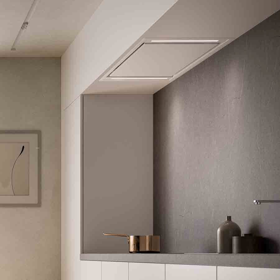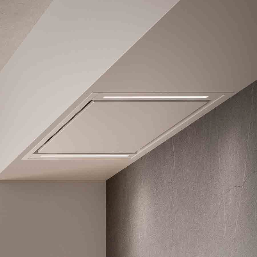 The Falmec Stella Plus 120 cm White ceiling hood blends Italian design and high performance ventilation with an ultra sleek, flush mounted profile that virtually disappears into the ceiling. Equipped with perimeter suction technology, it naturally pulls cooking fumes from the edges while keeping filters hidden yet fully accessible for effortless cleaning