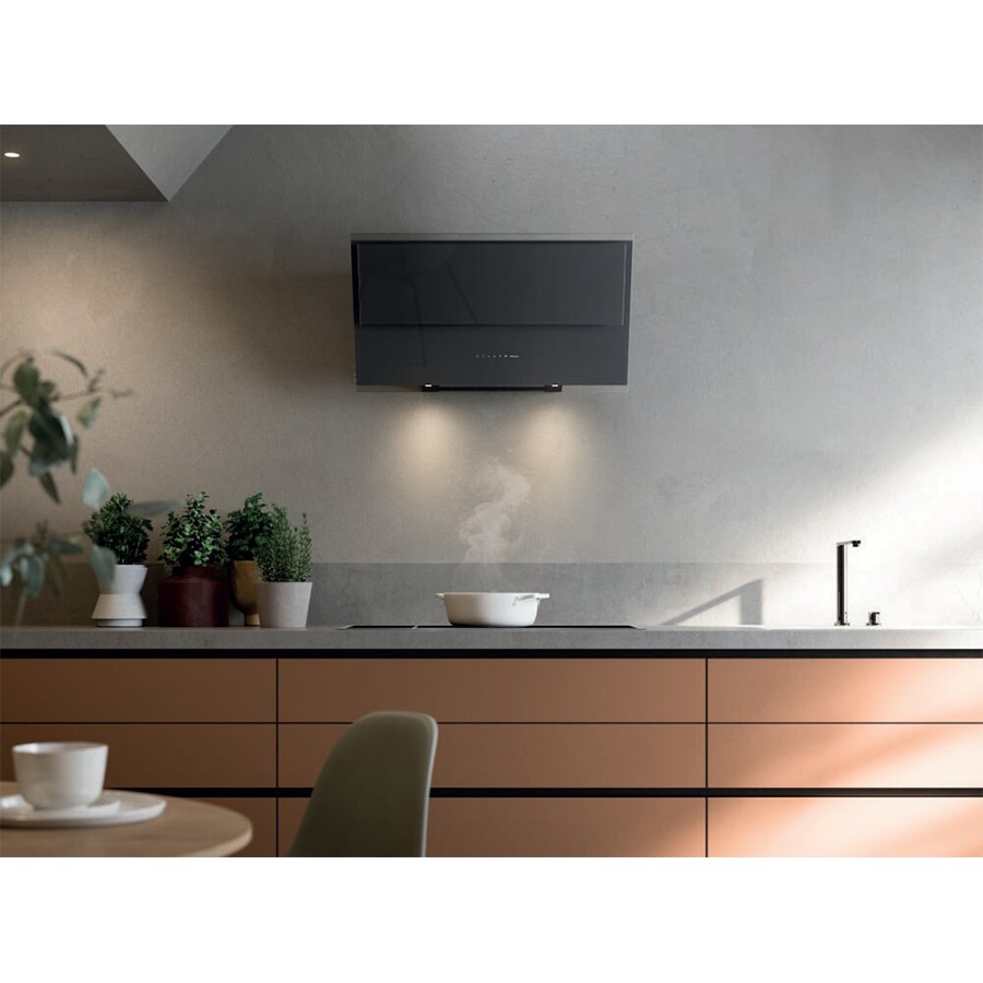 The Falmec Verso 85 cm wall-mounted hood in grey glass combines striking design with efficient performance. Dual suction zones, powered by an 800 m³/h motor, ensure effective fume extraction from both front and underside. Touch controls, dimmable LED lighting (2700–5600 K), and compatibility with Falmec’s Dialogue System offer smart functionality, while washable filters and optional Carbon.Zeo or charcoal filtration keep maintenance simple.