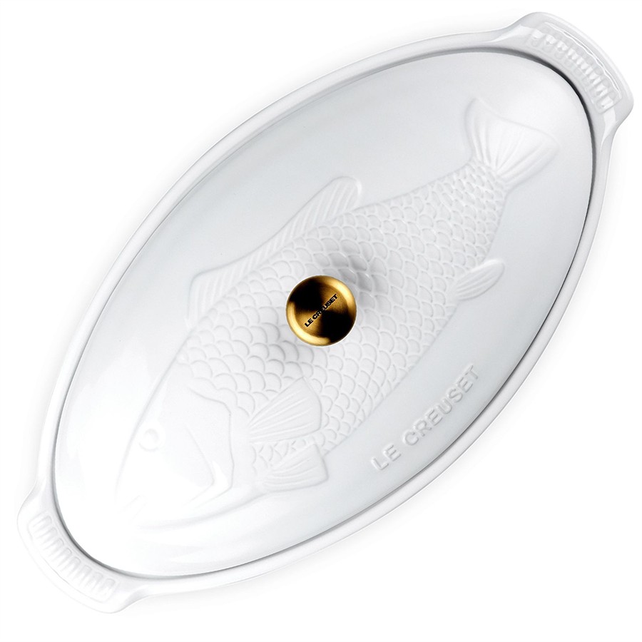 The Le Creuset Heritage Fish Dish is a beautifully crafted oval stoneware baking dish complete with an embossed fish motif and brushed gold knob that moves from oven to table in style. It features raised ridges in the base to elevate food and promote even browning while helping with easy removal of fish or meat. The stoneware retains heat well to keep food warm, and the matching lid locks in moisture and seals in aroma. Crafted to resist stains, cracking, and flavor absorption, it works safely and cleans effortlessly thanks to its smooth, glazed interior.