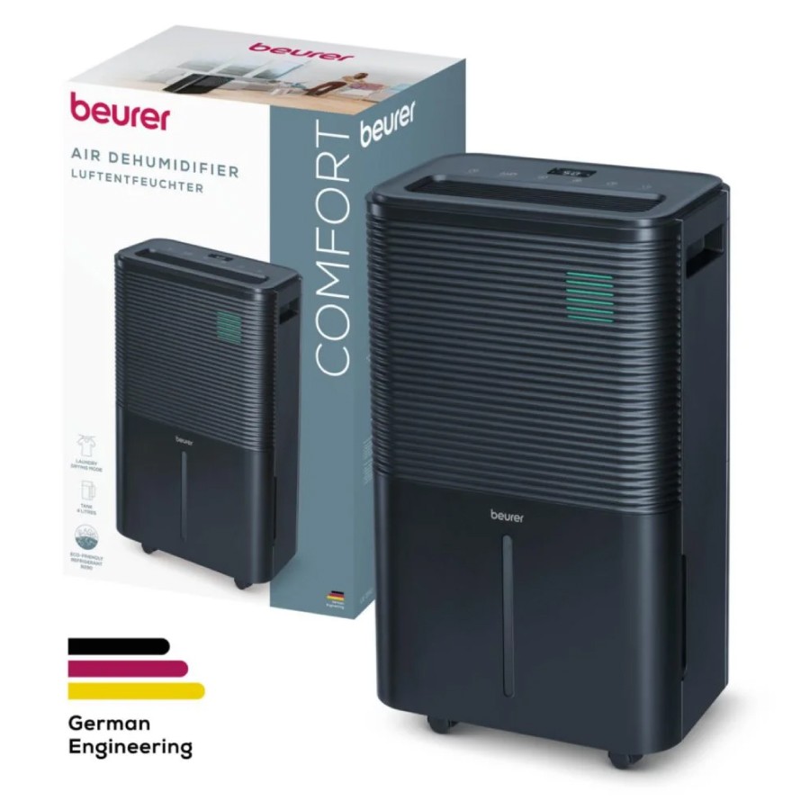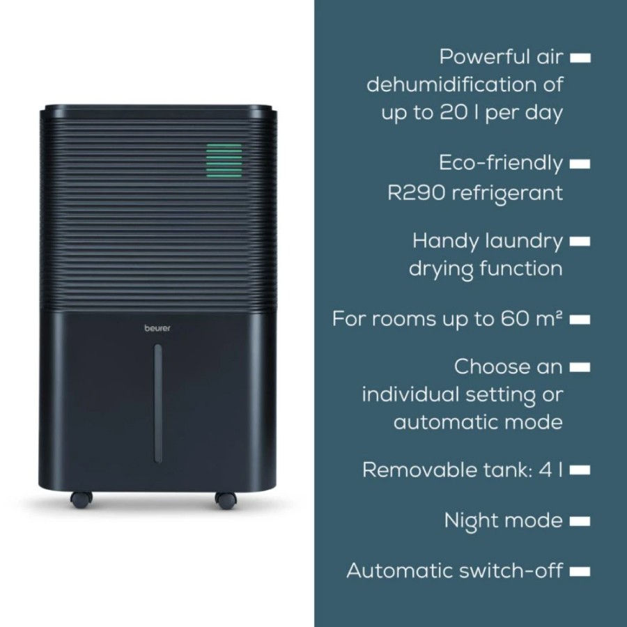Condensation on window panes, musty odours or mould can become bothersome or even harmful to health. The powerful LE 250 Air Dehumidifier from Beurer removes up to 20 litres of liquid from the ambient air every day, even in large rooms, and prevents the effects of excessive air humidity. With its automatic mode and quiet night mode, it is ideal for continuous dehumidification.