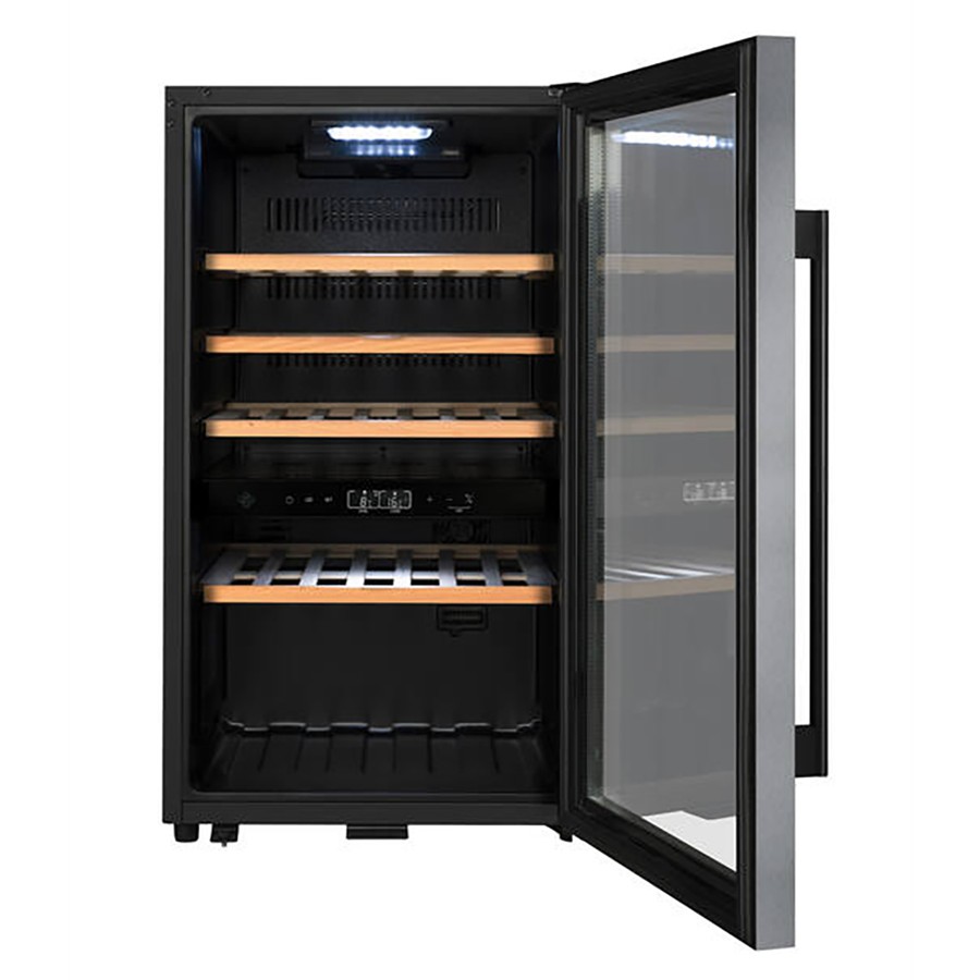 The La Sommeliere ECS512Z double compartment service wine cooler stores up to 49 bottles in two independently controlled temperature zones so you can chill red and white wines at their ideal serving conditions at the same time. It uses fan-assisted cooling with regulated humidity and an anti-vibration design to help protect wine quality, while UV-filtered glass and an active charcoal filter help reduce the effects of light and odours. Inside, adjustable shelves and interior lighting make organising and accessing bottles easy, and simple digital controls with alarm indicators give reliable everyday temperature monitoring and management for your cooler at home.