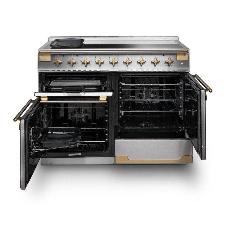 Introducing the Rangemaster Elise Luxe 110 ELS110EISS/AB — a stunning 110 cm induction range cooker finished in stainless steel with elegant antique brass accents. It features a 5-zone induction hob (total output up to 7.4 kW with boost functions), delivering fast, efficient heat control. The double-oven setup includes a multifunction main electric fan oven and a second fan oven, complemented by a 2.3 kW dual-circuit glide-out grill for flexible roasting and grilling.