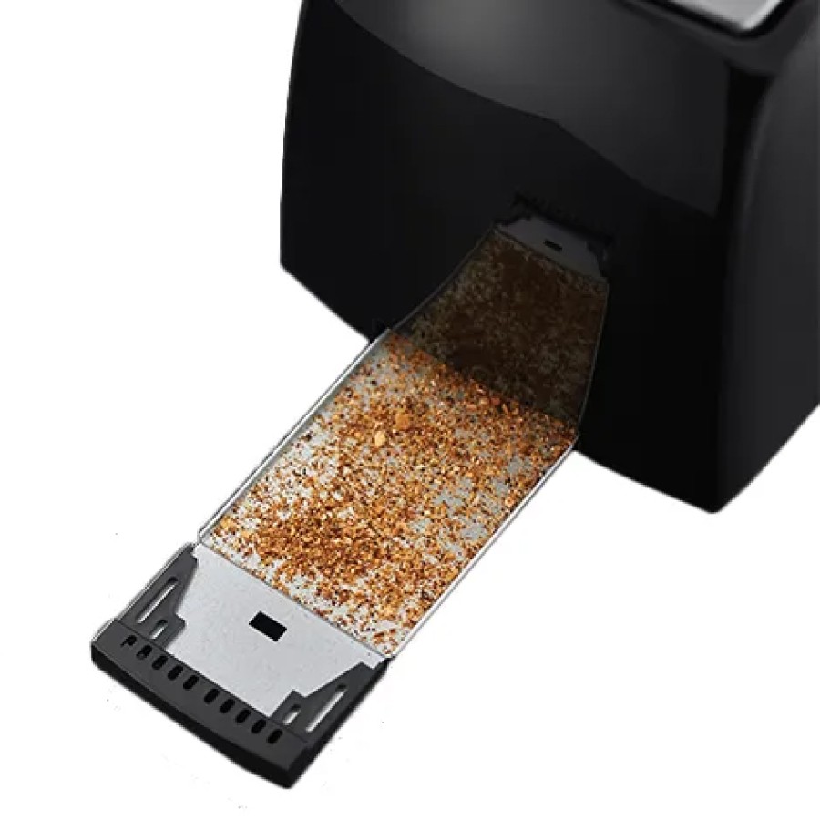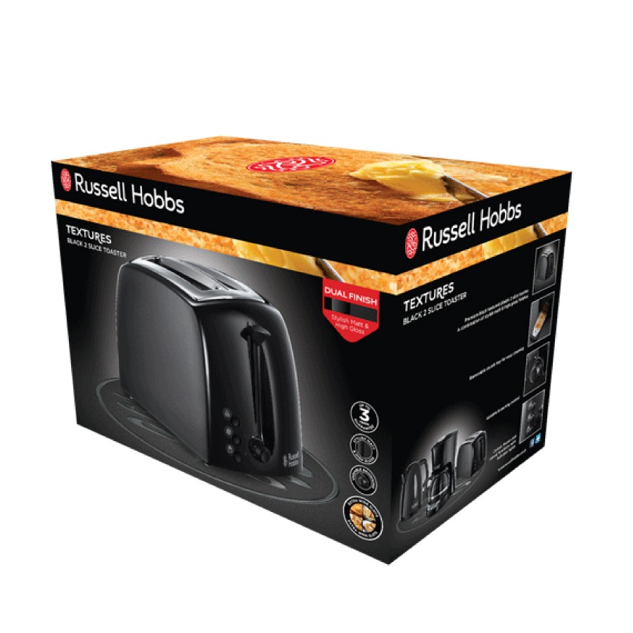 Enjoy perfect toast every morning with the Russell Hobbs Textures 2-Slice Toaster in sleek black, blending high-gloss and matte accents for a modern kitchen look. Its extra wide slots are perfect for thick breads, crumpets, tea cakes, or bagels, while six browning levels, plus frozen, reheat, and cancel functions, give you full control over your breakfast. The removable crumb tray keeps your countertop clean, and with its elegant ceramic material and robust 850W power, it delivers both style and performance at an attractive price.