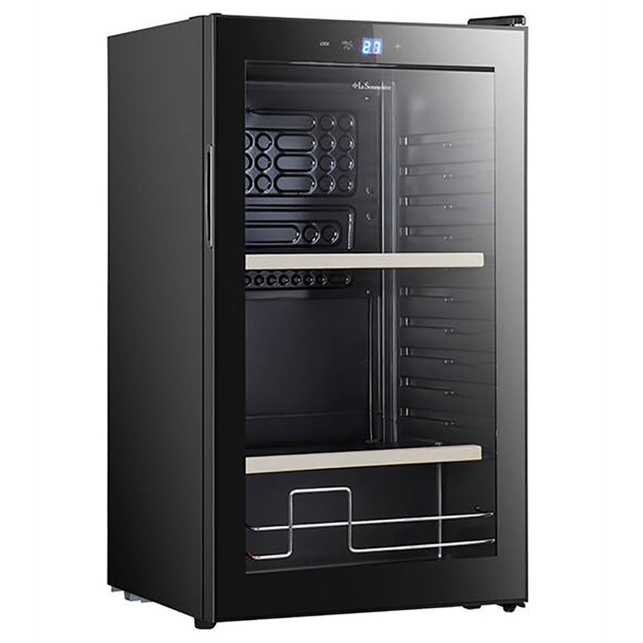 The La Sommeliere SLS41 temperature-control wine cooler stores up to 39 bottles in a stable adjustable internal environment that helps preserve and chill wines at ideal conditions. It features fan-assisted cooling with regulated humidity and an anti-vibration design to help protect wine quality, while UV-filtered glass and an active charcoal filter help reduce exposure to light and odours. Inside, adjustable shelves and interior LED lighting make organising and accessing bottles straightforward, and intuitive digital controls with alarm alerts provide reliable everyday temperature monitoring and management for your cooler at home.