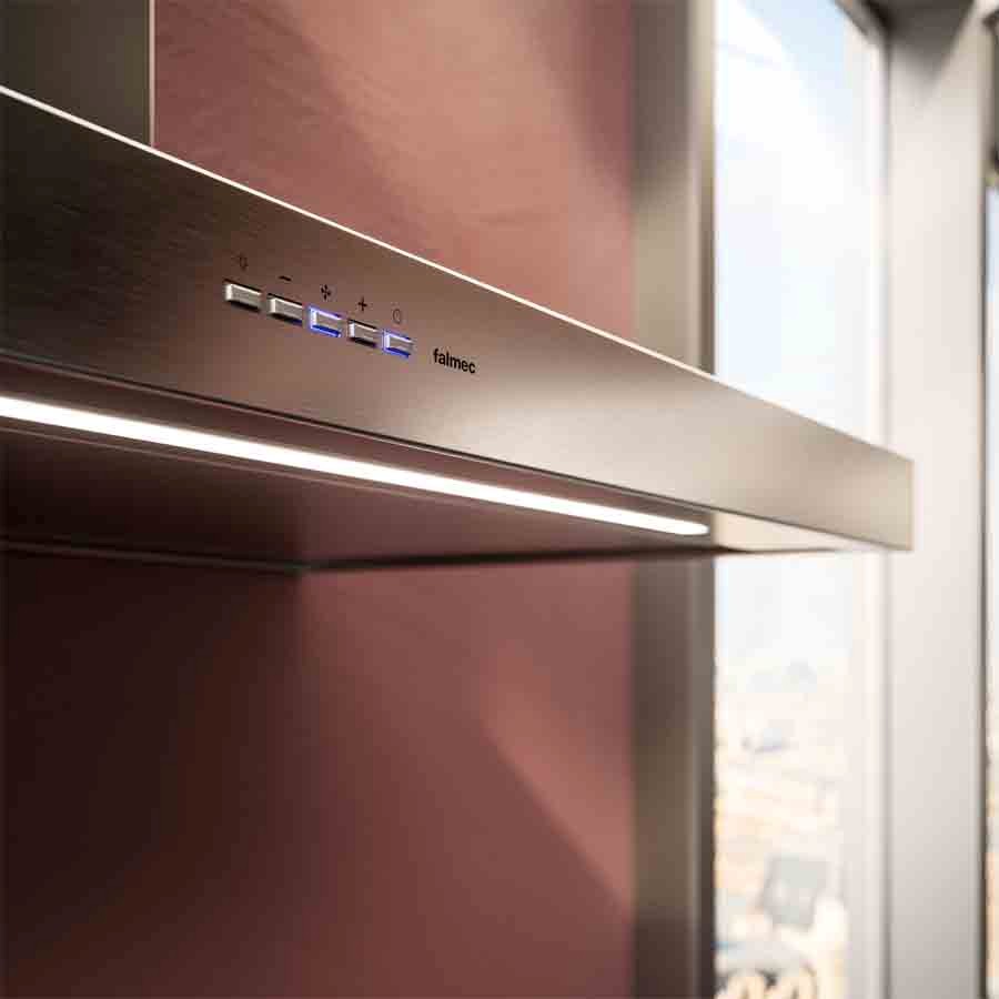 Crafted from premium AISI 304 stainless steel with a Scotch Brite finish, the Falmec Plane Plus 90 cm wall mounted hood combines professional grade performance with minimalist elegance. Its sleek inverted-T form features powerful perimeter suction driven by an 800 m³/h motor (boost to 680 m³/h), ensuring rapid removal of cooking vapors while maintaining quiet operation (around 66-69 dB). Equipped with dynamic, dimmable LED lighting (2 700-5 600 K) for perfect ambiance, an intuitive electronic control panel, and easily removable washable grease filters, it’s designed for effortless use and maintenance. With optional remote control, Carbon Zeo filter compatibility, and Falmec’s Dialogue System for seamless hob to hood integration, this energy efficient Class A appliance is the stylish, smart upgrade your kitchen needs