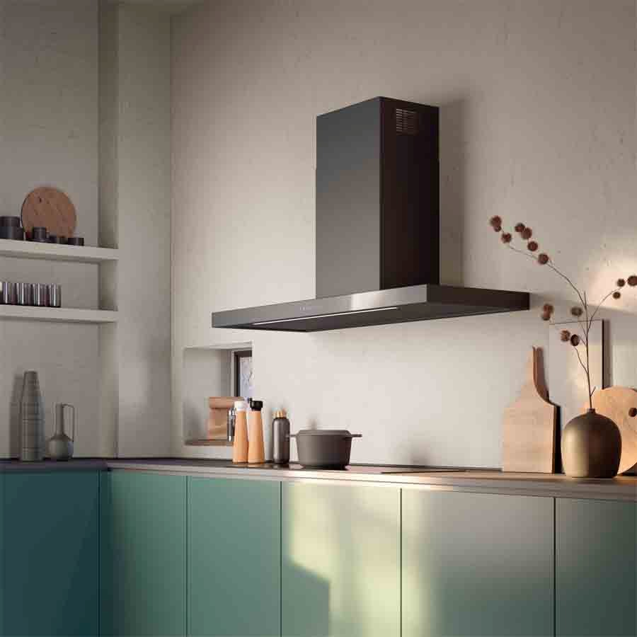 Crafted in elegant Scotch Brite AISI 304 stainless steel and finished in deep matte black, the Falmec Plane Plus NRS 120 cm wall hood combines sleek aesthetics with premium kitchen performance. Powered by an 800 m³/h motor and featuring patented NRS noise reduction perimeter suction, it delivers professional grade extraction while maintaining a whisper quiet ambiance (as low as 50 dB). Enjoy dynamic dimmable LED lighting (2 700-5 600 K), intuitive electronic controls, and hassle-free cleaning with removable metal filters plus optional features like Carbon Zeo recirculation filters and a remote. With Falmec’s Dialogue System ensuring seamless hob to hood coordination and its energy efficient Class A rating, this hood elevates both the style and functionality of any contemporary kitchen.