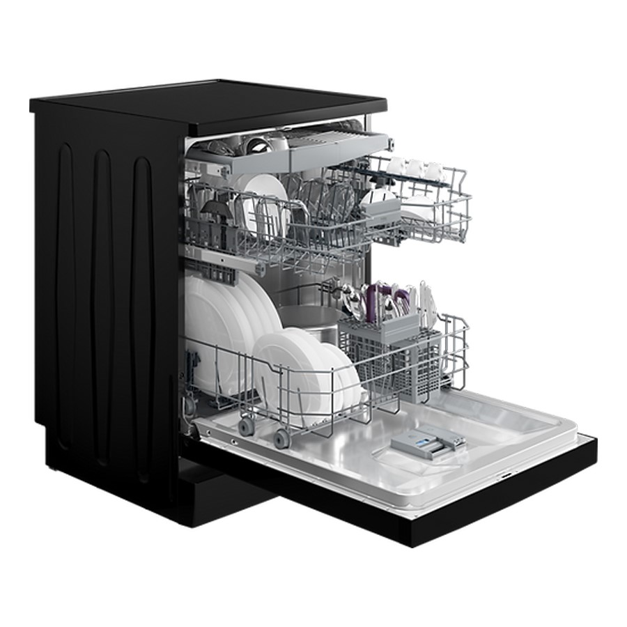 This full-size freestanding dishwasher is built to handle up to 15 place settings, making it ideal for large households or frequent entertainers. It features a variety of wash programs, providing flexibility for everything from delicate glassware to heavily soiled cookware. The sleek black finish adds a modern and stylish touch to any kitchen, while the adjustable racks and spacious interior ensure efficient use of space. With its energy-efficient performance and quiet operation, this dishwasher offers both convenience and elegance, delivering spotless dishes with minimal effort.